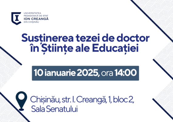 Candidat: BUNDĂ CARMEN Conducător științific: SILISTRARU Nicolae, dr. hab., prof. univ. Tema tezei: FORMAREA CULTURII MORALE LA ELEVII DIN ÎNVĂȚĂMÂNTUL PRIMAR DIN PERSPECTIVA COMPETENȚEI PEDAGOGICE Specialitatea: 531.01 Teoria generală a educației Data: 10.01.2025 Ora: 14:00 Locul: Sala Senatului, Universitatea Pedagogică de Stat „Ion Creangă” din Chișinău Componența Comisiei de Susținere Publică […]