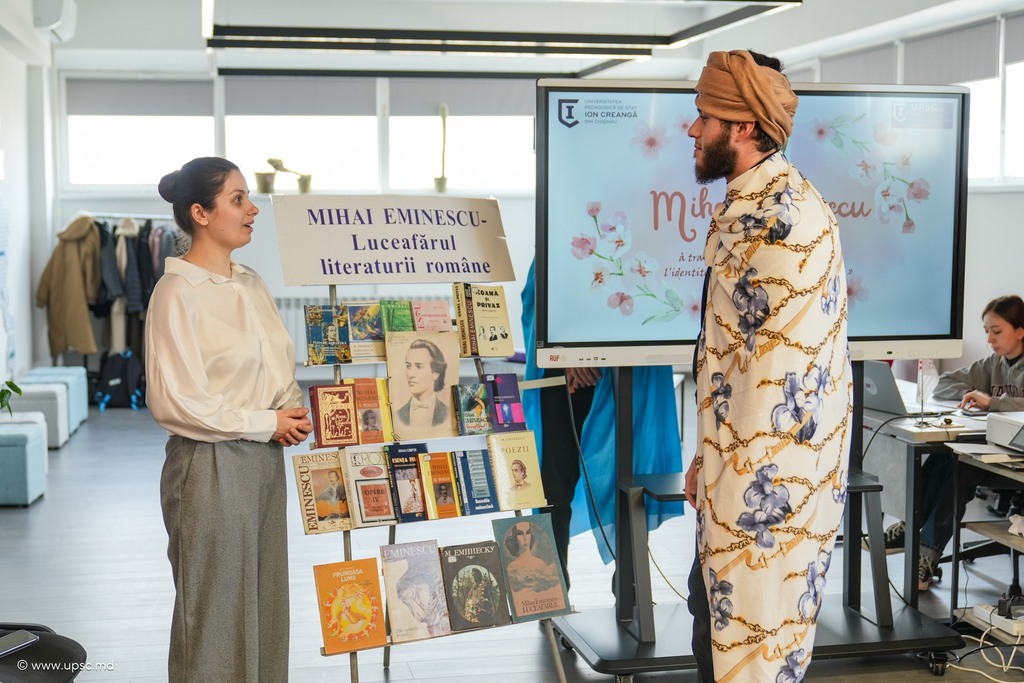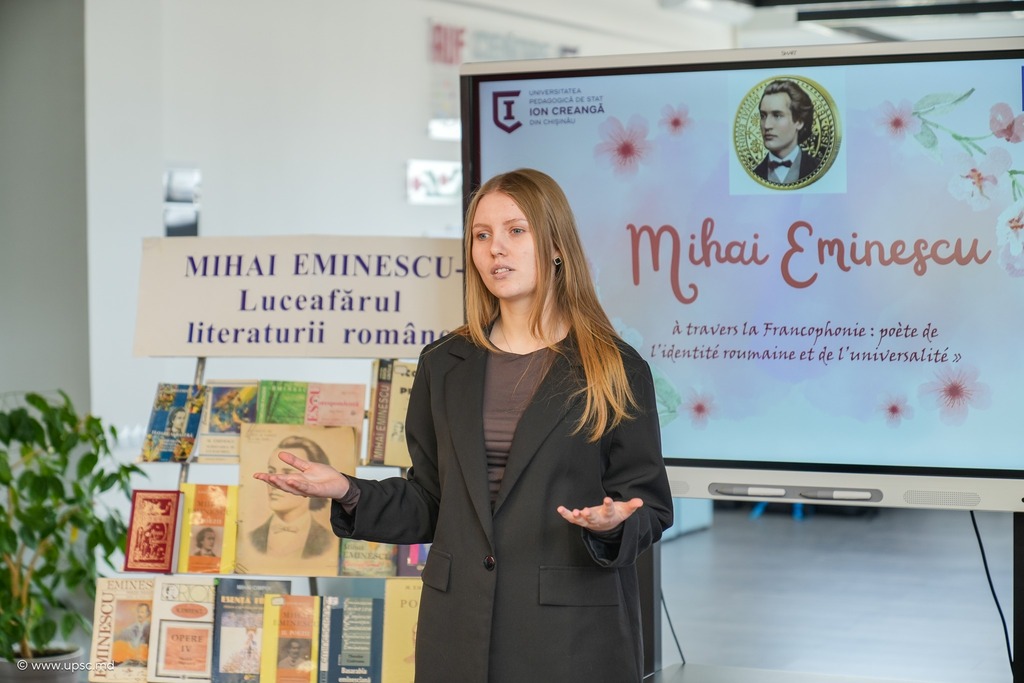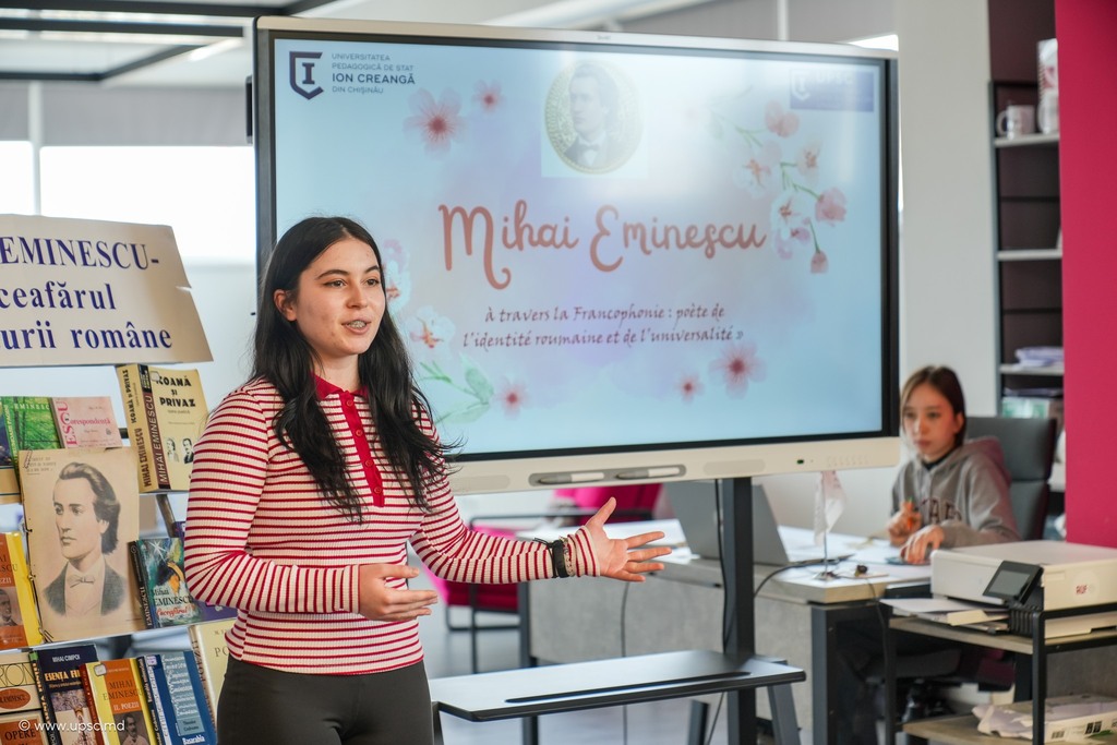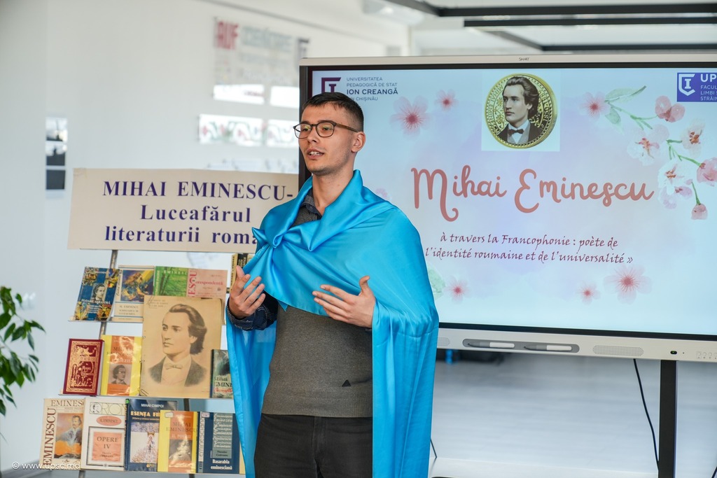 În data de 19 martie, programul activităților francofone organizate de Catedra de Filologie Romanică și Germanică a continuat cu o Cafenea literară și un recital de poezie dedicat marelui poet român Mihai Eminescu, în contextul celebrăriii celor 175 de ani de la naștere „Mihai Eminescu à travers la Francophonie : poète de l’identité roumaine et de l’universalité ». Studenții francofoni au vorbit despre viața și opera marelui Eminescu, au recitat poeme în limba franceză, au participat la diverse ateliere interactive și un quiz care au pus în valoare opera eminesciană. Membrii juriului : d. Martin Desabres, dna Diana Donoagă și dna Vera Zdraguș au apreciat prestația studenților pentru recitalul de poezie după cum urmează :