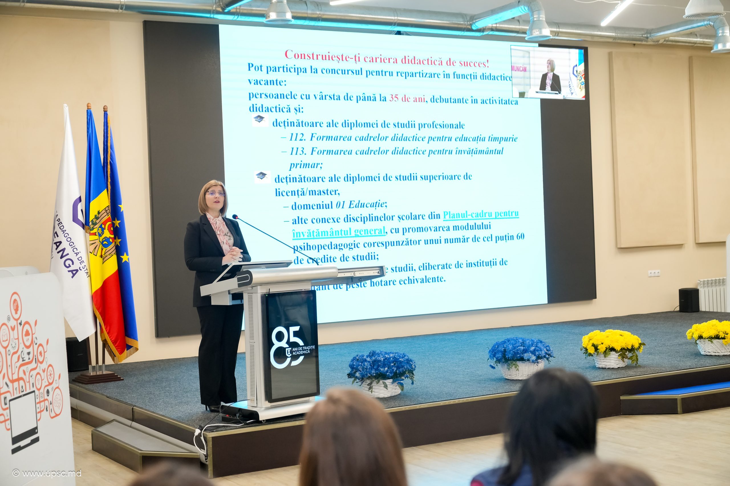 În continuarea discuției, secretarul de stat al Ministerului Educației și Cercetării, Galina RUSU, a prezentat oferta educațională și a explicat întreg procesul de încadrare în câmpul muncii pentru viitorii absolvenți. De asemenea, au fost comunicate statisticile ministerului cu referire la funcțiilor vacante în domeniul învățământului, care prezintă circa 1540 de oferte. În această perioadă, absolvenții pot solicita și vizita în instituțiile de învățământ, în baza unui program stabilit. Absolventa programului Pedagogia învățământului primar, RANCIUC-LAZĂR Ana și-a împărtășit experiența proprie de activare ca învățătoare la clasele primare, despre avantajele și oportunitățile actuale ale cadrelor didactice.