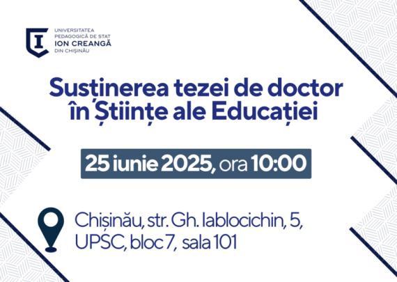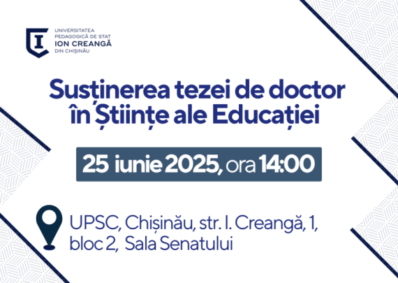 Candidat: Dumitrașcu Doina-Maria Conducător științific: Bocancea Viorel, doctor în pedagogie, conferențiar universitar, Universitatea Pedagogică de Stat „Ion Creangă” din Chișinău, Republica Moldova Tema tezei: DEZVOLTAREA COMPETENȚEI DE CERCETARE/INVESTIGARE LA DISCIPLINA GEOGRAFIE ÎN CICLUL LICEAL Specialitatea: 532.02. Didactica școlară pe trepte și discipline de învățământ (Geografie) Data: 25.06.2025 Ora: 14:00 Locul: […]