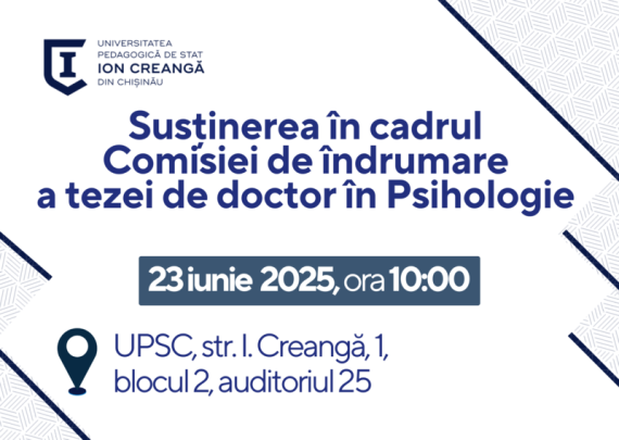 Candidat: Cozman Tatiana Conducător științific: Racu Iulia profesor universitar, doctor habilitat în psihologie Tema tezei: „Стиль жизни как фактор психологического благополучия” Specialitatea științifică: 511.02. Psihologia dezvoltării și psihologia educațională Data: 23 iunie 2025 Ora: 10:00 Locul: Universitatea Pedagogică de Stat „Ion Creangă” din Chișinău, Bl. 2, auditoriul 25 Componența comisiei […]