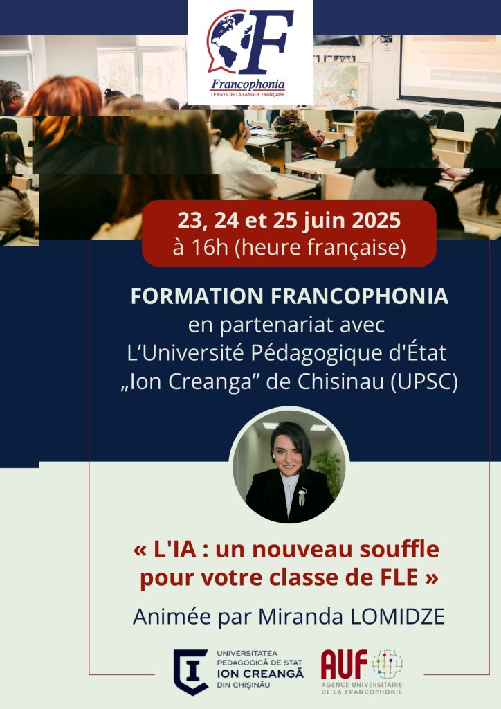 Centrul de Angajabilitate Francofon al Universității Pedagogice de Stat „Ion Creangă” din Chișinău anunță o formare în format online pentru toți studenții francofoni și profesorii lor, cu titlul „Inteligența artificială: un nou elan pentru predarea limbii franceze”, care face parte din axa nr.2, formare de soft skills.