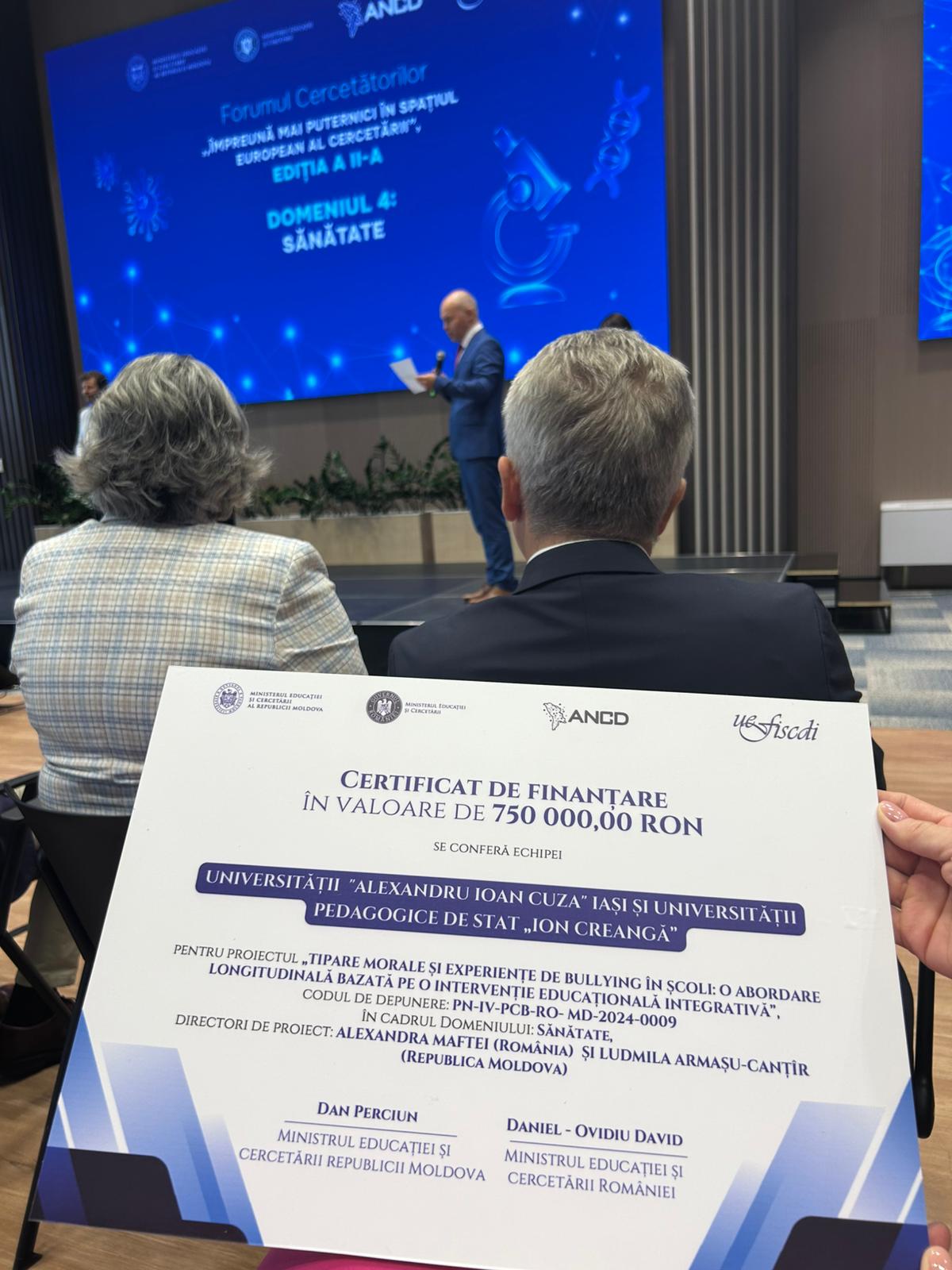 Sâmbătă, 23 august 2025, Unitatea Executivă pentru Finanțarea Învățământului Superior, a Cercetării, Dezvoltării și Inovării (UEFISCDI), Ministerul Educației și Cercetării al Republicii Moldova (MEC) și Agenția Națională pentru Cercetare și Dezvoltare din Republica Moldova (ANCD) au organizat un eveniment festiv dedicat lansării oficiale a proiectelor câștigătoare, în cadrul căruia au fost înmânate de către Daniel David, ministrul educației și cercetării din România și Dan Perciun, ministrul educației și cercetării din Republica Moldova, Certificatele oficiale ale proiectelor câștigătoare. Evenimentul a constituit un foarte bun prilej de promovare a vectorului european în cercetare-dezvoltare printr-un schimb de idei și de bune practici cu oficiali din România și Republica Moldova, rectori, prorectori, cercetători și invitați de onoare din comunitatea academică și de cercetare.