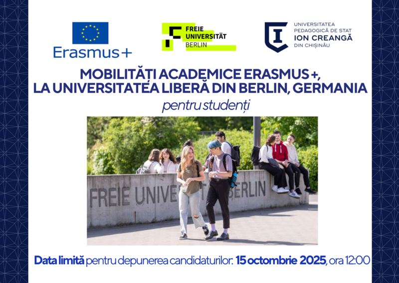 Secția Relații Internaționale și Managementul Proiectelor a UPSCanunță depunerea dosarelor de candidatură pentru 2 burse de studii pentru studenții înscriși la programele de studii Istorie la Universitatea Liberă din Berlin, Germania pentru perioada aprilie-iulie 2026.