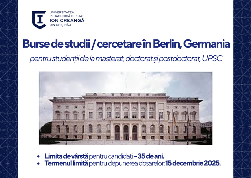 Secția Relații Internaționale și Managementul Proiectelor a UPSC informează că:Fundația pentru Educație a Camerei Reprezentanților din Berlin anunță apelul de candidatură pentru burse de cercetare în toate domeniile pentru masteranzii, doctoranzii și postdoctoranzii care provin din țările participante la cel de-al IIlea Război Mondial și care doresc să studieze sau să utilizeze facilități de cercetare la o universitate din Berlin.