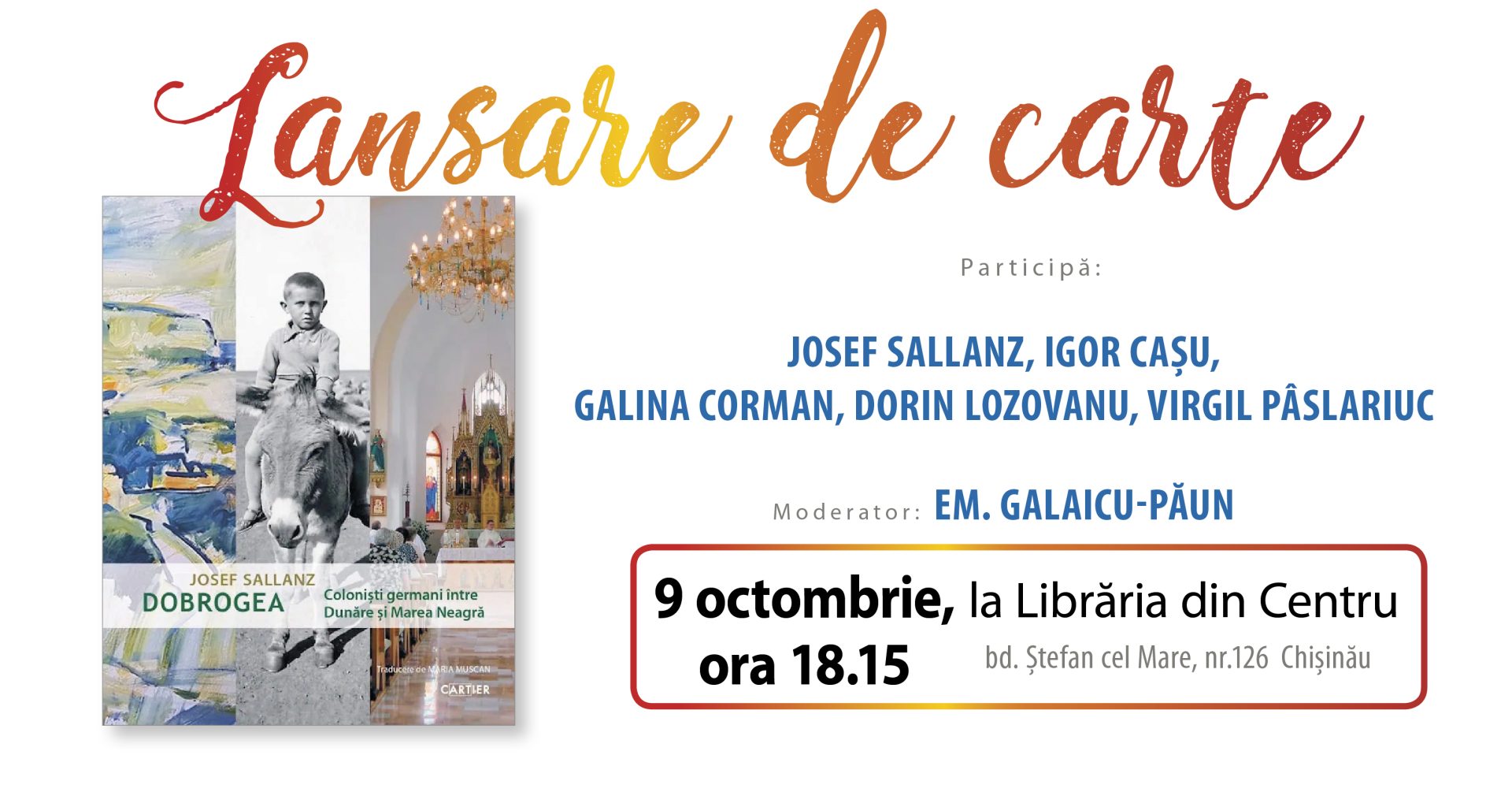 Joi, 9 octombrie, ora 18:15, vă invităm la prezentarea volumului „Dobrogea. Coloniștii germani între Dunăre și Marea Neagră” de Josef Sallanz, lector al Serviciului German de Schimb Academic (DAAD) la Universitatea Pedagogică de Stat „Ion Creangă” din Chișinău, apărut la Editura Cartier, în colecția Art (coord. Vitalie Coroban).