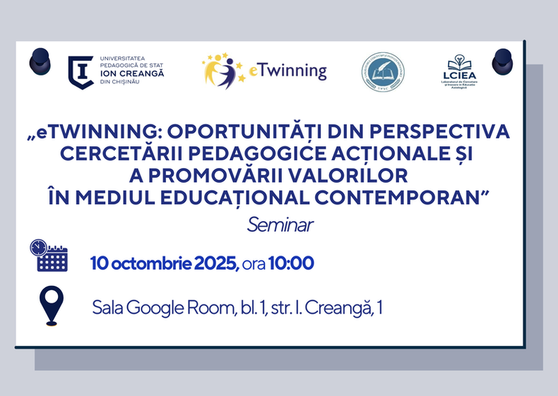 LABORATORUL CERCETĂRI ȘI INOVAȚII PEDAGOGICE și LABORATORUL DE CERCETARE ȘI INOVARE ÎN EDUCAȚIA AXIOLOGICĂ organizează semianrul „Etwinning: oportunități din perspectiva cercetării pedagogice acționale și apromovării valorilor în mediul educațional contemporan”.