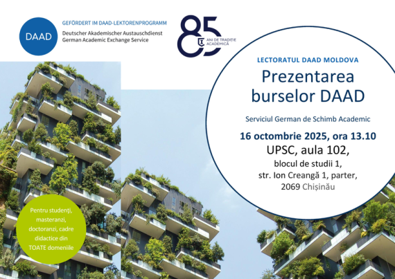 Pe 16 octormbrie 2025, la ora 13:10, toți studenții de la Universitatea Pedagogică de Stat „Ion Creangă” din Chișinău sunt așteptați în Aula 102 a UPSC (str. Ion Creangă 1, bl. 1) la o întâlnire specială cu lectorul DAAD, dr. Josef Sallanz. În cadrul evenimentului, vor fi prezentate bursele Serviciului […]