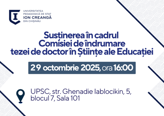 Candidat: CERNEI Andriana Conducător științific: CABAC Valeriu, doctor, profesor universitar Tema tezei:METODOLOGIA FORMĂRII ȘI DEZVOLTĂRII LA ELEVII-LICEENI A COMPETENȚEI DE REALIZARE A EXPERIENȚELOR ÎN ȘTIINȚELE UMANISTICE (ÎN CADRUL STUDIERII MODULELOR LA ALEGERE ÎN CURSUL DE INFORMATICĂ) Specialitatea științifică: 532.02 Didactica școlară pe trepte și discipline de învățământ. Data: 29.10.2025 Ora: 16.00 Locul: Universitatea Pedagogică de Stat […]