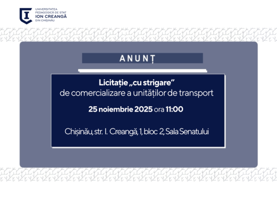I.P. Universitatea Pedagogică de Stat “Ion Creangă” din Chișinău anunță pentru data de 25.11.2025 ora 11.00 pe adresa: mun. Chișinău, str. I. Creangă nr. 1, blocul de studii nr. 2, etajul 1, biroul 3 – Sala Senatului, desfășurarea licitației „cu strigare” de comercializare a unităților de transport, conform datelor din […]