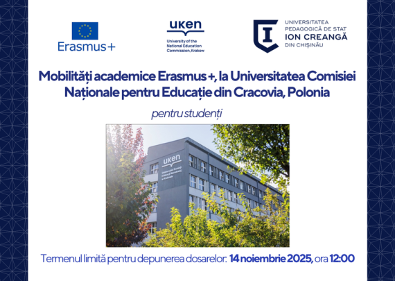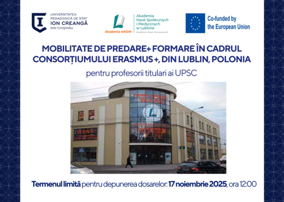 Secția de Relații Internaționale și Managementul Proiectelor a Universității Pedagogice de Stat „Ion Creangă” din Chișinău anunță concurs de depunere a dosarelor pentruo bursă de predare +formare pentru profesorii titulari ai UPSC în cadrul Consorțiumului Erasmus+ din Lublin, Polonia, în baza proiectului 2025-1-PL01-KA171-HED-000343879. Termen limită de depunere a dosarelor de […]