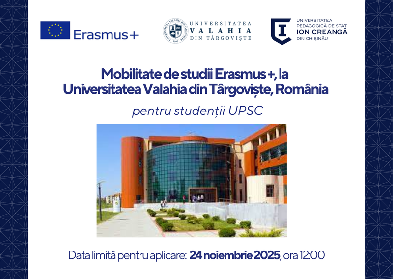 Dosarele vor fi depuse la Secția Relații Internaționale și Managementul Proiectelor, str. Ion Creangă 1, bl. 2, of. 25 și online, în format PDF la erasmus.plus@upsc.md până la 24 noiembrie 2025 (ora 12:00).
