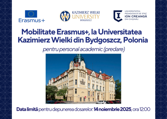 Secția de Relații Internaționale și Managementul Proiectelor a Universității Pedagogice de Stat „Ion Creangă” din Chișinău anunță concurs de depunere a dosarelor pentru2 (două) burse de predarepentru profesorii UPSC, la Centrul Universitar Pitești al Universității Naționale de Știință și Tehnologie Politehnica București. Termen limită de depunere a dosarelor de candidatură: 14 noiembrie, 2025, […]