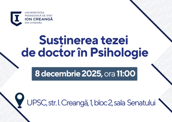 Candidat: CUCUI CORINA Conducător științific: GLAVAN AURELIA, prof. univ., dr. hab. în psihologie Tema tezei: Dezvoltarea psiho-emoțională a copiilor cu diabet zaharat Specialitatea: 511.02 Psihologia dezvoltării și psihologia educațională Data: 08.12.2025 Ora: 11:00 Locul: Universitatea Pedagogică De Stat „Ion Creangă” din Chişinău, blocul 2, sala Senatului Președinte: RACU IULIA, prof. univ., dr. hab., UPSC Conducător de […]