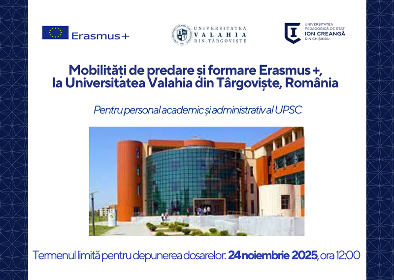 Secția Relații Internaționale și Managementul Proiectelor a UPSC anunță depunerea dosarelor de candidatură pentru 2 burse de formare și 2 burse de predare  (5 zile, pentru semestrul II al anului academic 2025-2026) la Universitatea Valahia din Târgoviște.