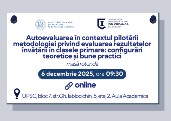 Universitatea Pedagogică de Stat „Ion Creangă” din Chișinău, Catedra Pedagogia Învățământului Primar, în parteneriat cu Ministerul Educației și Cercetării al Republicii Moldova, organizează masa rotundă „Autoevaluarea în contextul pilotării metodologiei privind evaluarea rezultatelor învățării în clasele primare: configurări teoretice și bune practici”. Masa rotundă își propune să reunească cercetători și […]