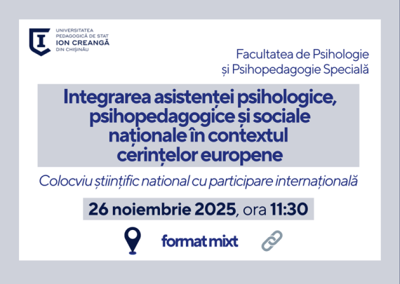 Universitatea Pedagogică de Stat „Ion Creangă” din Chișinău, Facultatea de Psihologie și Psihopedagogie Specială organizează Colocviul științific national cu participare internațională „Integrarea asistenței psihologice, psihopedagogice și sociale naționale în contextul cerințelor europene”. Colocviul urmărește identificarea strategiilor eficiente de adaptare a intervențiilor educaționale și psihosociale la nevoile actuale ale beneficiarilor, în […]
