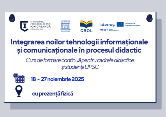 Universitatea Pedagogică de Stat „Ion Creangă” din Chișinău organizează în perioada 18 noiembrie – 4 decembrie 2025 cursul de formare continuă Integrarea noilor tehnologii informaționale și comunicaționale în procesul didactic. Cursul de formare se va desfășura cu prezență fizică. Programul de pregătire cuprinde 15 ore, din care activitate de curs […]