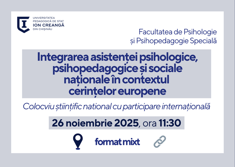 Universitatea Pedagogică de Stat „Ion Creangă” din Chișinău, Facultatea de Psihologie și Psihopedagogie Specială organizează Colocviul științific national cu participare internațională „Integrarea asistenței psihologice, psihopedagogice și sociale naționale în contextul cerințelor europene”.