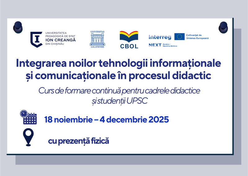 Universitatea Pedagogică de Stat „Ion Creangă” din Chișinău organizează în perioada 18 noiembrie – 4 decembrie 2025 cursul de formare continuă Integrarea noilor tehnologii informaționale și comunicaționale în procesul didactic.