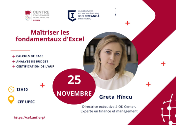 Centrul de Angajabilitate Francofon al Universității Pedagogice de Stat „Ion Creangă” din Chișinău invită studenții francofoni să participe la atelierul cu tema „Excel: noțiuni de bază”, organizat în cadrul axei nr. 2: formare de competențe transversale (soft-skills). În calitate de formator, este invitată doamna Greta HÎNCU, directoare executivă a OK […]