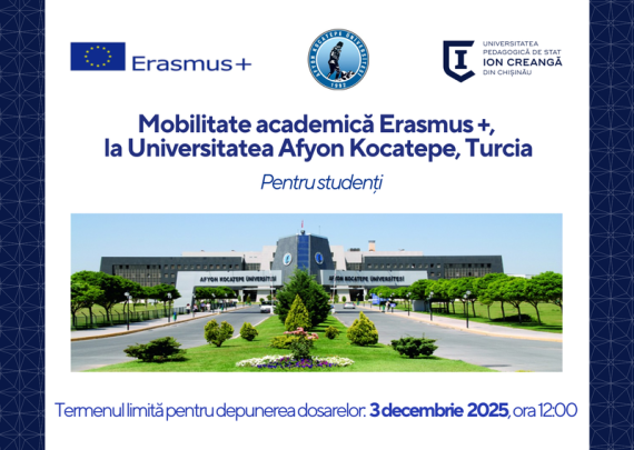 Secția Relații Internaționale și Managementul Proiectelor a #UPSCanunță extinderea perioadei de depunere a dosarelor de candidatură pentru 1 bursă de studii (5 luni) pentru studenții din ciclul Licență, program de studii Didactica limbii engleze (studenții anului I si ai anilor terminali nu sunt eligibili) la Universitatea Afyon Kocatepe, Turcia pentru […]