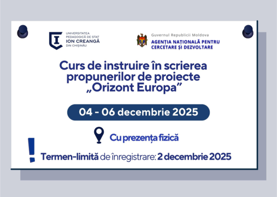 Secția pentru Managementul Cercetării, Dezvoltării și Inovării a Universității Pedagogice de Stat „Ion Creangă” din Chișinău organizează un program de formare structurat și aplicat, dedicat procesului de redactare a propunerilor de proiecte în cadrul programului european „Orizont Europa”. Formarea se adresează tuturor angajaților UPSC: cadrelor didactice universitare, cercetătorilor și tuturor […]