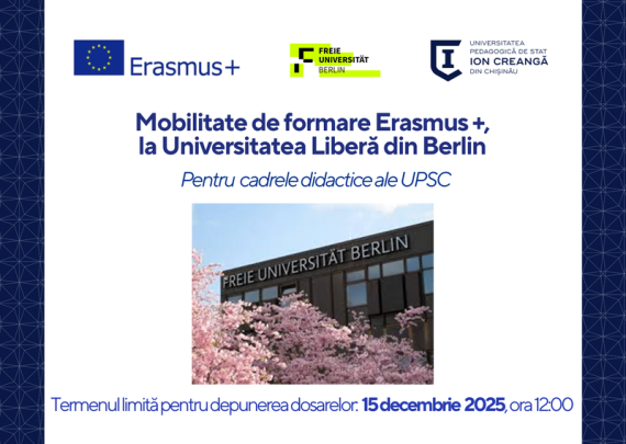 Secția Relații Internaționale și Managementul Proiectelor a UPSC anunță concurs de depunere a dosarelor de candidatură pentru 3 (TREI) BURSE DE FORMARE pentru personalul titular pentru a participa în activitățile din cadrul săptămânii internaționalizării în perioada 22 – 26 iunie 2026, la Universitatea Liberă din Berlin, Germania. Domeniul: https://www.fu-berlin.de/en/international/faculty-staff/mobility-staff/staff-week/international-week-2026/index.html Dosarele […]