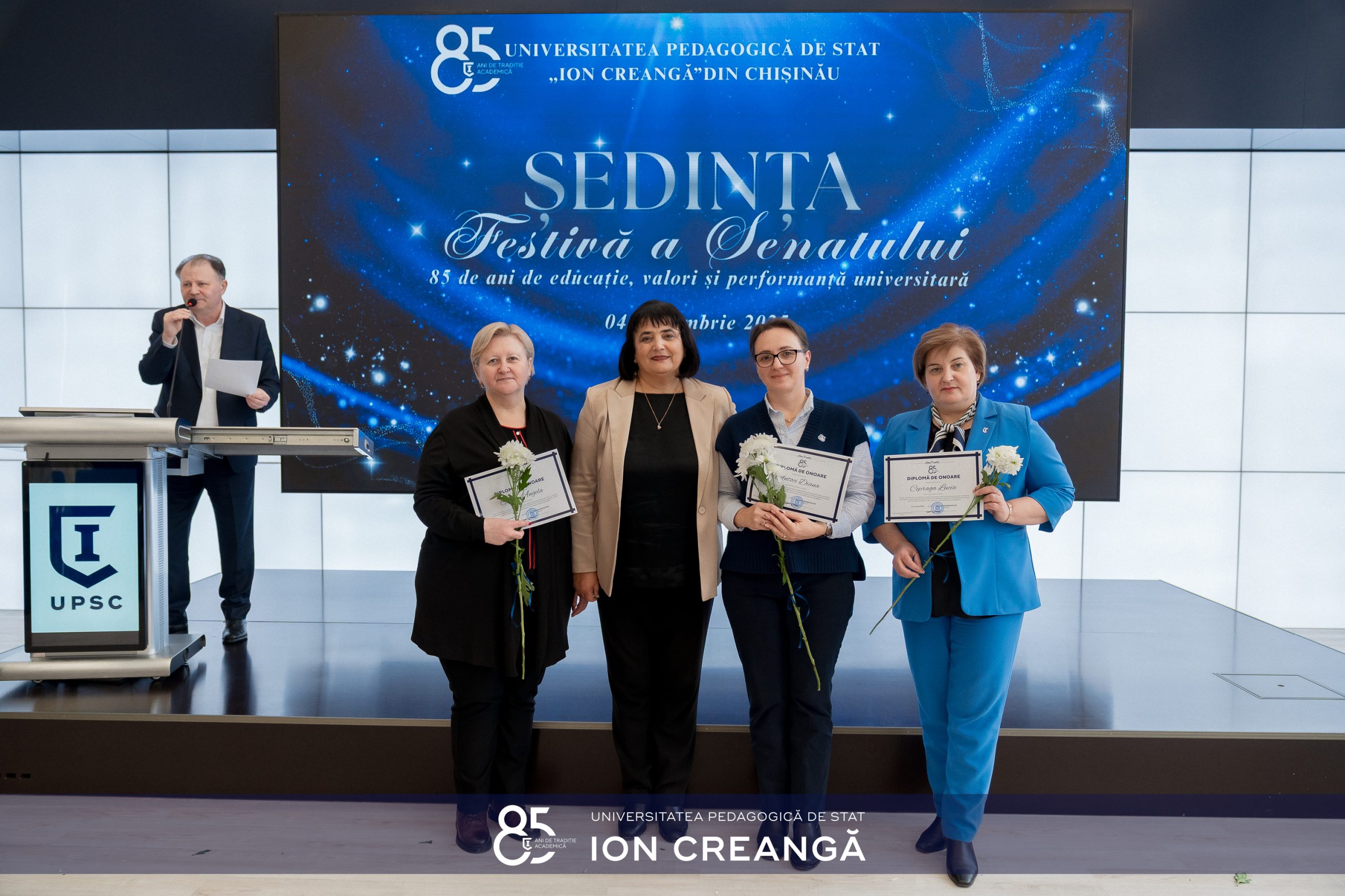 Evenimentul s-a încheiat cu intonarea Imnului „Gaudeamus” și proiectarea Drapelului UPSC, un moment de solemnitate care a reafirmat angajamentul universității de a fi un pilon al excelenței pedagogice.