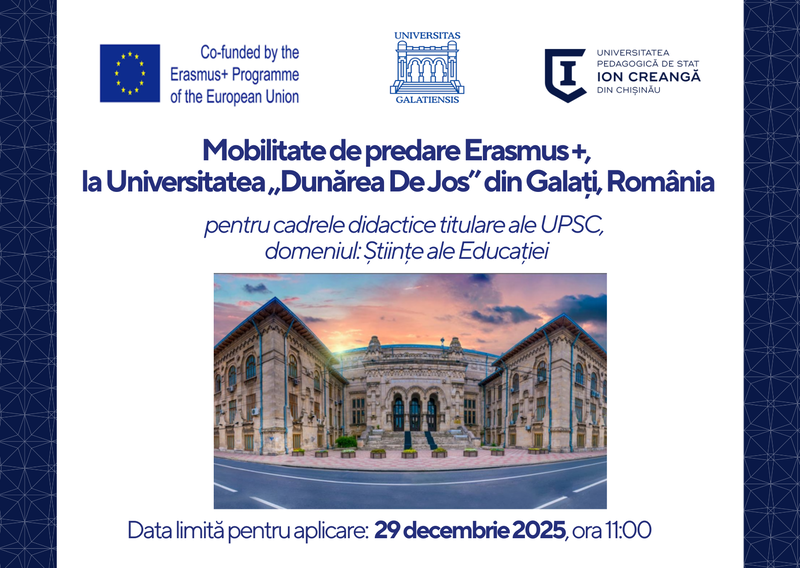 Dosarele vor fi depuse la Secția Relații Internaționale și Managementul Proiectelor, str. Ion Creangă 1, bl. 2, of. 25 și online, în format PDF la erasmus.plus@upsc.md până la 29 decembrie, 2025 (ora 11:00).