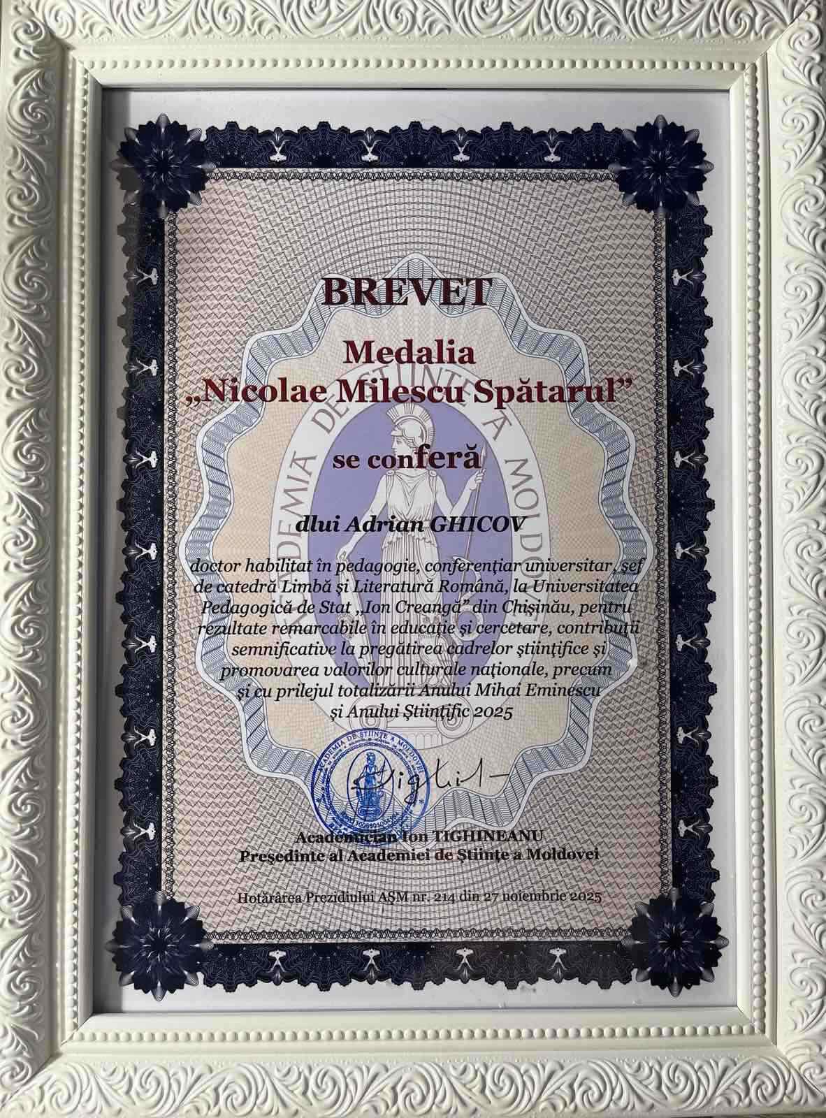 Această distincție, una dintre cele mai importante decorații ale AȘM, poartă numele marelui cărturar și diplomat moldovean Nicolae Milescu Spătaru, simbolizând erudiția și deschiderea spre orizonturile cunoașterii universale, i-a fost acordată dlui Adrian Ghicov pentru rezultate remarcabile în educație și cercetare, contribuții semnificative în pregătirea cadrelor științifice și promovarea valorilor culturale naționale, precum și cu prilejul totalizării Anului Mihai Eminescu și Anului Științific 2025.