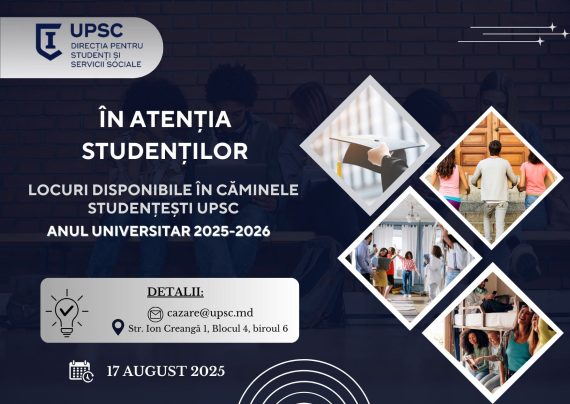 Dragi studenți, Universitatea Pedagogică de Stat „Ion Creangă” din Chișinău oferă locuri de cazare în căminele studențești pentru anul academic 2025–2026. Căminele sunt repartizate în funcție de gradul de confort: Gradul I – camere renovate, mobilier modern, baie comună pe secție, frigider și bucătărie la comun.Gradul II – camere cu dotări […]
