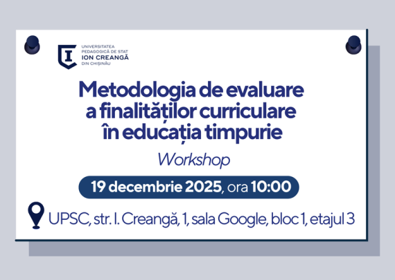 Vineri, 19 decembrie 2025, ora 10:00, str. Ion Creangă, 1 sala Google, Bloc 1, etajul 3, va avea loc workshopul „Metodologia de evaluare a finalităților curriculare în educația timpurie”, din cadrul subprogramului de cercetare 040104 „Monitorizarea implementării curricula pentru educația timpurie și învățământul primar”. Workshopul este dedicat abordării aspectelor actuale […]
