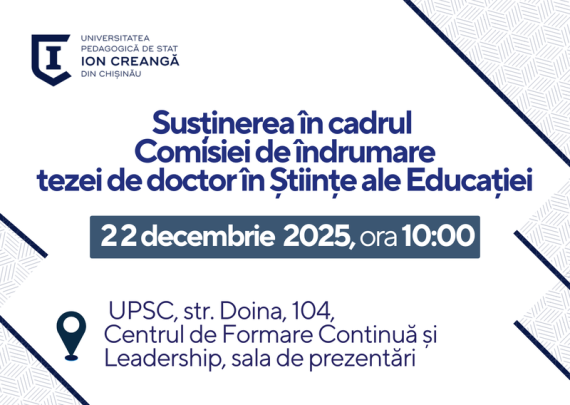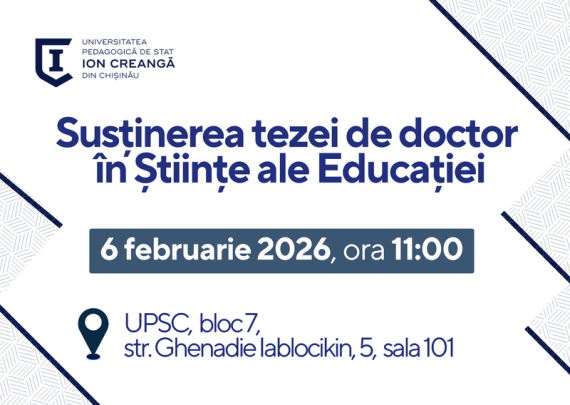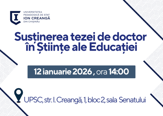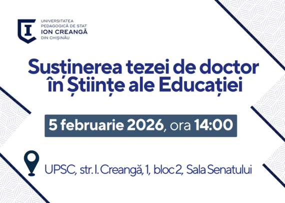 Candidat: PĂTRAȘCU Alina Conducător științific: SAVCA Lucia, dr., conf. univ. Tema tezei: Dezvoltarea inteligenţei emoţionale la adolescenţi cu diferite tipuri de atașament Specialitatea: 511.02. Psihologia dezvoltării și psihologia educațională Data: 09.02.2026 Ora: 11:00 Locația: Universitatea Pedagogică de Stat „Ion Creangă” din Chișinău, str. Ion Creangă, nr. 1, blocul de studii […]