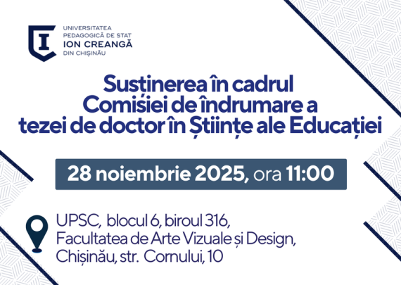 Candidat: Railean Stela Conducător științific: Simac Ana, conf.univ., dr. Tema tezei: „Banda desenată și desenul animat ca mediu inovativ de învățare” Specialitatea științifică: 532.02 – Didactica școlară pe trepte și discipline de învățământ Data: 28.11.2025 Ora: 11:00 Locul: Facultatea de Arte Vizuale și Design, Universitatea Pedagogică de Stat Ion Creangă din […]