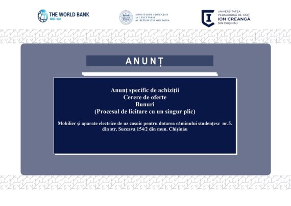 Anunț specific de achiziții Cerere de oferte Bunuri (Procesul de licitare cu un singur plic) Țara: Republica Moldova Instituția: Instituția Publică Universitatea Pedagogică de Stat „Ion Creangă” din Chișinău Titlul proiectului: Învățământul Superior din Moldova (PÎSM ) Titlul subproiectului: Renovarea căminului studențesc nr. 5, adresa mun. Chișinău, str. Suceava nr. […]