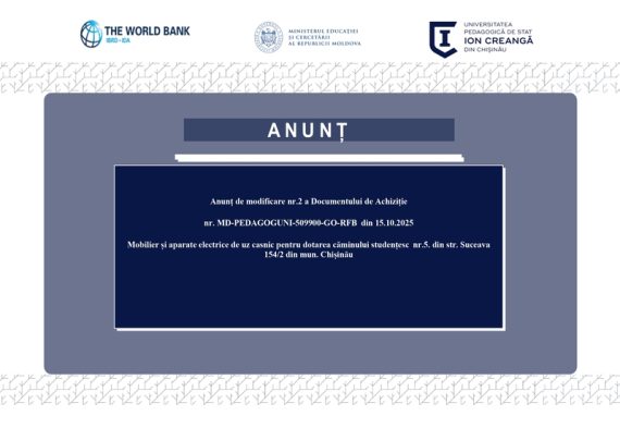 Anunț de modificare nr.2 a Documentului de Achiziție nr. MD-PEDAGOGUNI-509900-GO-RFB din 15.10.2025, modificat prin amendamentul nr.1 din 31.10.2025 Mobilier și aparate electrice de uz casnic pentru dotarea căminului studențesc nr.5. din str. Suceava 154/2 din mun. Chișinău Nr. CDO: MD-PEDAGOGUNI-509900-GO-RFB Autoritatea contractantă: Instituția Publică Universitatea Pedagogică de Stat „Ion […]